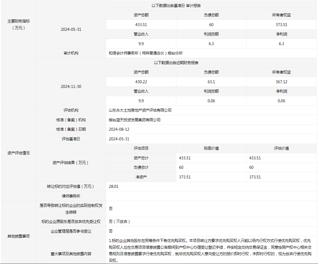 轉讓方:煙臺藍天投資控股集團有限公司