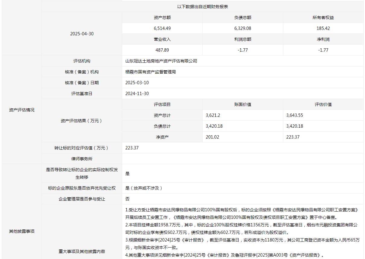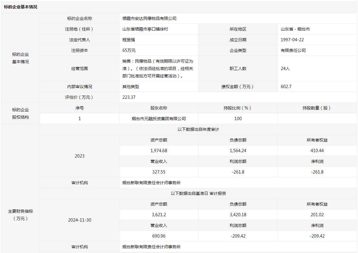 棲霞市安達民爆物品有限公司100%國有股權(quán)及債權(quán)